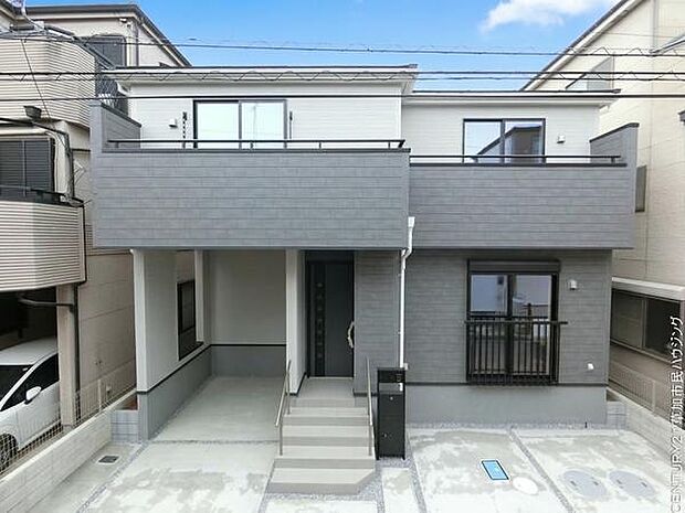 • モダンな印象の外観が魅力的で、中央に配置された玄関が印象的な戸建てです。2階バルコニーが目を引くデザインで、落ち着いた色合いが周囲と調和。ゆったりとしたアプローチが開放感を演出しています。