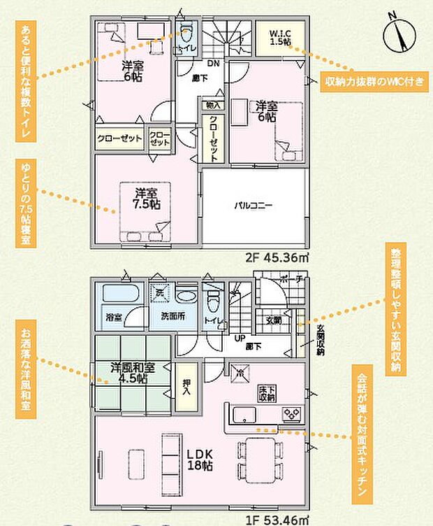 間取り内訳:リビングダイニングキッチン 18帖(1階)・和室 4.5畳(1階)・洋室 7.5帖(2階)・洋室 6帖(2階)・洋室 6帖(2階)