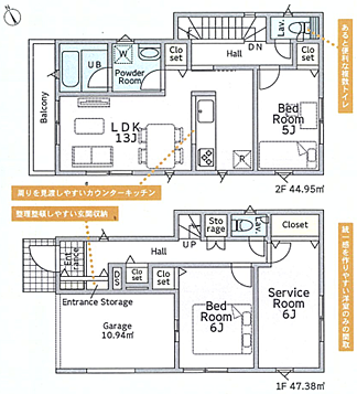 間取り内訳:洋室 6帖(1階)・収納 6帖(1階)・リビングダイニングキッチン 13帖(2階)・洋室 5帖(2階)