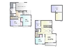 | 間取り | 2LDK 間取り内訳:リビングダイニングキッチン 16.8帖(2階)・洋室 4.8帖(2階)・洋室 6.3帖(1階)・収納 4.6帖(1階)・その他 3帖(2階) |