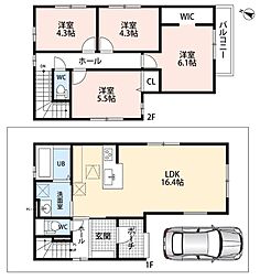 間取り内訳:リビングダイニングキッチン 16.4帖(1階)・洋室 6.1帖(2階)・洋室 5.5帖(2階)・洋室 4.3帖(2階)・収納 4.3帖(2階)