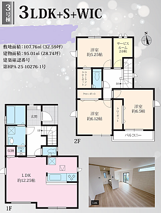 | 間取り | 3SLDK 間取り内訳:リビングダイニングキッチン 12.2帖(1階)・収納 2帖(2階)・洋室 6.5帖(2階)・洋室 6.1帖(2階)・洋室 5.2帖(2階) |