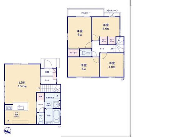 | 間取り | 4LDK 間取り内訳:リビングダイニングキッチン 15.8帖(1階)・洋室 6帖(2階)・洋室 5帖(2階)・洋室 4.6帖(2階)・洋室 4.5帖(2階) |