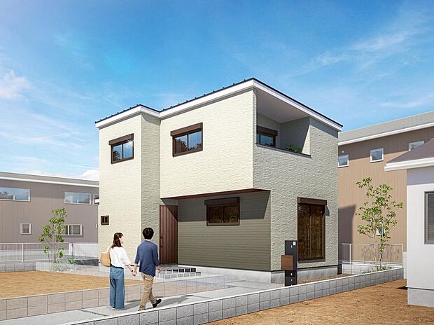 • 外観予想パース ■駅近くの閑静な立地。道路から奥まっているため、車の騒音や人通りを気にせず静かに暮らせます。お子様の飛び出しも防げ安心です。