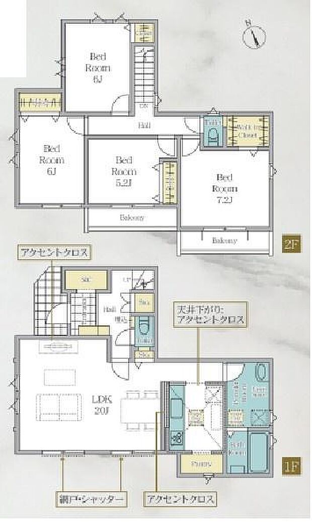 間取り内訳:リビングダイニングキッチン 20帖(1階)・洋室 6帖(2階)・洋室 6帖(2階)・洋室 5.2帖(2階)・洋室 7.2帖(2階)