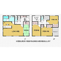 | 間取り | 4LDK 間取り内訳:リビングダイニングキッチン 15帖(1階)・和室 6畳(1階)・洋室 9帖(2階)・洋室 7.5帖(2階)・洋室 4.5帖(2階) |
