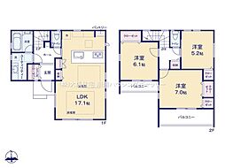 | 間取り | 3LDK 間取り内訳:洋室 6帖(2階)・洋室 5.2帖(2階)・洋室 4.5帖(2階)・リビングダイニングキッチン 17.1帖(1階) |