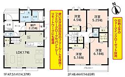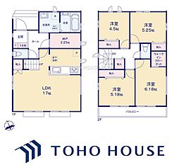 間取り内訳:リビングダイニングキッチン 17帖(1階)・収納 2.2帖(1階)・洋室 6.1帖(2階)・洋室 5.2帖(2階)・洋室 5.1帖(2階)・洋室 4.5帖(2階)