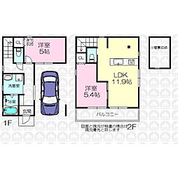 | 間取り | 2SLDK 間取り内訳:リビングダイニングキッチン 13.4帖(2階)・洋室 5.3帖(3階)・洋室 5帖(3階)・収納(1階) |