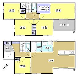 間取り内訳:洋室 5帖(1階)・洋室 8帖(2階)・洋室 5.3帖(2階)x2・収納 3帖(2階)・リビングダイニングキッチン 15.8帖(1階)