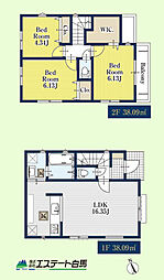 | 間取り | 3LDK(WIC付) 間取り内訳:リビングダイニングキッチン 16.3帖(1階)・洋室 6.1帖(2階)x2・洋室 4.3帖(2階) |