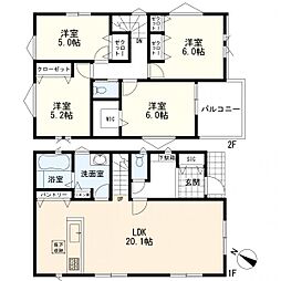 間取り内訳:リビングダイニングキッチン 18帖(1階)・洋室 6帖(2階)・洋室 6.3帖(2階)・洋室 4.5帖(2階)・洋室 4.5帖(2階)
