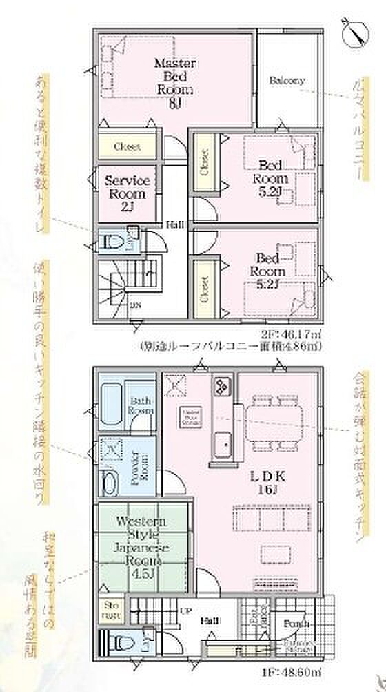 | 間取り | 4SLDK 間取り内訳:リビングダイニングキッチン 16帖(1階)・和室 4.5畳(1階)・洋室 8帖(2階)・洋室 5.2帖(2階)x2・収納 2帖(2階)x2 |