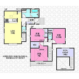 | 間取り | 3LDK(※ロフト4帖) 間取り内訳:リビングダイニングキッチン 15帖(1階)・洋室 7帖(2階)・洋室 5.2帖(2階)x2・その他 4帖 |