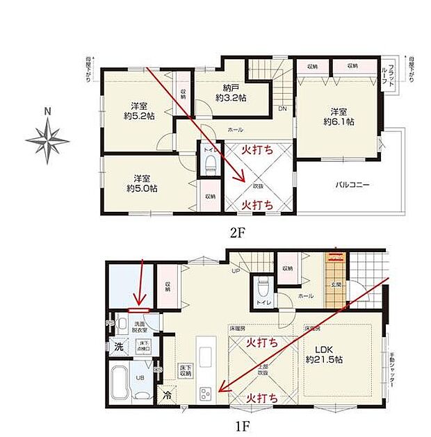 | 間取り | 3LDK 間取り内訳:リビングダイニングキッチン 21.5帖(1階)・洋室 5.2帖(2階)・洋室 5帖(2階)・洋室 6.1帖(2階) |