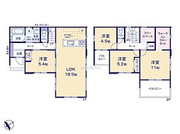| 間取り | 4LDK 間取り内訳:リビングダイニングキッチン 18.5帖(1階)・洋室 5.4帖(1階)・洋室 4.5帖(2階)・洋室 5.2帖(2階)・洋室 11帖(2階) |