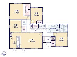 | 間取り | 4LDK(4LDK+ウォークインクローゼット) 間取り内訳:リビングダイニングキッチン 17.7帖(1階)・洋室 5.4帖(1階)・洋室 7.7帖(2階)・洋室 5.4帖(2階)・洋室 5.4帖(2階) |