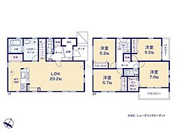 | 間取り | 4LDK(DEN・ファミリークローク・床下収納・ウォークインクローゼット) 間取り内訳:リビングダイニングキッチン 20.2帖(1階)・洋室 7.2帖(2階)・洋室 6帖(2階)x2・洋室 5.2帖(2階) |