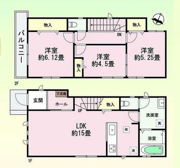 | 間取り | 3LDK 間取り内訳:洋室 4.5帖(2階)・リビングダイニングキッチン 15帖(1階)・洋室 5.2帖(2階)・洋室 6.1帖(2階) |