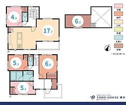| 間取り | 4LDK 間取り内訳:洋室 5帖(1階)・洋室 6帖(1階)・洋室 6.8帖(1階)・洋室 5.2帖(2階)・リビングダイニングキッチン 18.2帖(2階) |