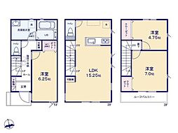6畳超のルーフバルコニー付き。LDKは対面キッチン採用の新築分譲住宅です。