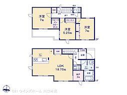 間取り内訳:リビングダイニングキッチン 18帖(1階)・洋室 7帖(2階)・洋室 5帖(2階)・洋室 5帖(2階)・洋室 4.5帖(2階)