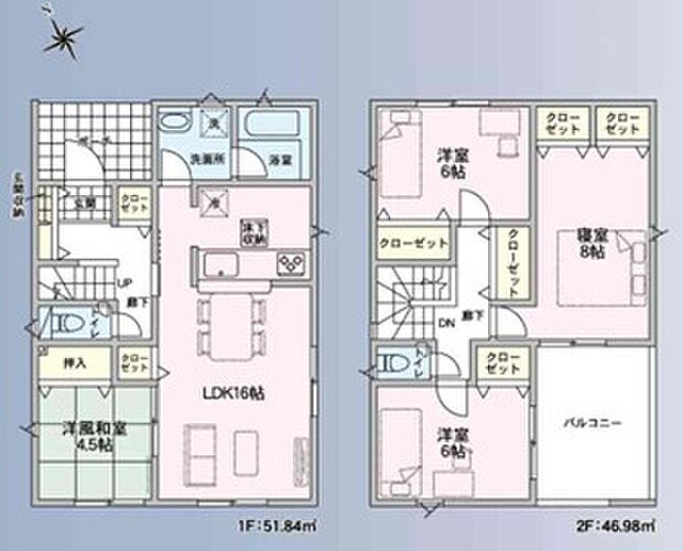 | 間取り | 4LDK 間取り内訳:和室 4.5畳(1階)・リビングダイニングキッチン 16帖(1階)・洋室 8帖(2階)・洋室 6帖(2階)・洋室 6帖(2階) |