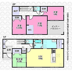 | 間取り | 4SLDK 間取り内訳:リビングダイニングキッチン 16帖(1階)・和室 4.5畳(1階)・洋室 7.5帖(2階)・洋室 6帖(2階)・洋室 5.3帖(2階)・収納(2階) |