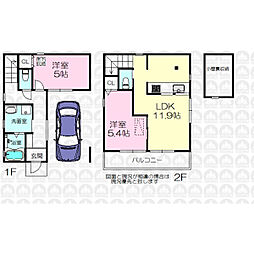 | 間取り | 2SLDK 間取り内訳:リビングダイニングキッチン 13.4帖(2階)・洋室 5.3帖(3階)・洋室 5帖(3階)・収納(1階) |