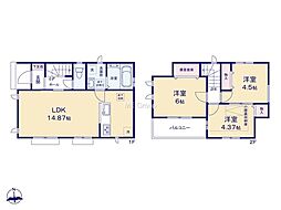 | 間取り | 4LDK 間取り内訳:リビングダイニングキッチン 14.8帖(1階)・洋室 6帖(2階)・洋室 4.5帖(2階)・洋室 4.3帖(2階) |