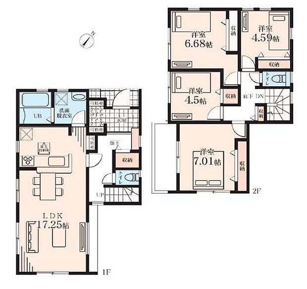 | 間取り | 4LDK 間取り内訳:リビングダイニングキッチン 17.2帖(1階)・洋室 6.6帖(2階)・洋室 4.5帖(2階)・洋室 4.5帖(2階)・洋室 7帖(2階) |