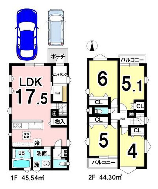 | 間取り | 4LDK 間取り内訳:リビングダイニングキッチン 17.5帖(1階)・洋室 6帖(2階)・洋室 5.1帖(2階)・洋室 5帖(2階)・洋室 4帖(2階) |