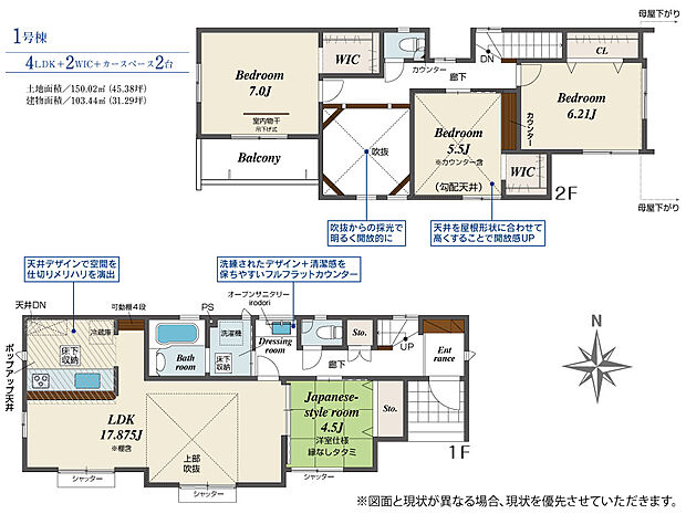 - 「建築条件付き土地」の「建物プラン例」は、土地購入者の設計プランの一例であり、プランの採用可否は任意です。