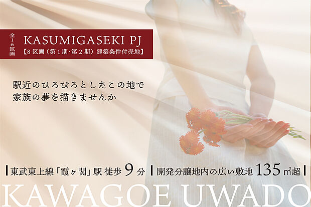 駅近のひろびろとした、この地で家族の夢を描きませんか。東武東上線「霞ヶ関」駅 徒歩9分に全16区画の大型開発分譲。全区画135m2を超え、駅近でありながらのびのびした環境の街並みが形成されます。 【予約制】物件説明会&プラン相談会を開催中!※お打合せの際は、川越市小仙波の川越住宅展示場や、若葉駅近くの街角展示場がございます。お気軽にお問い合せ下さい。