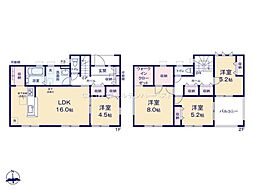 | 間取り | 4LDK 間取り内訳:リビングダイニングキッチン 16帖(1階)・洋室 4.5帖(1階)・洋室 5.2帖(2階)x2・洋室 8帖(2階) |