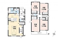| 間取り | 4LDK 間取り内訳:リビングダイニングキッチン 16帖(1階)・洋室 7帖(2階)・洋室 5.7帖(2階)・洋室 5.2帖(2階)・洋室 5.2帖(2階) |