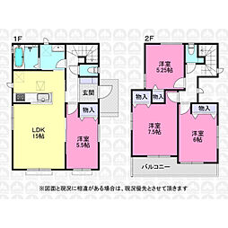 | 間取り | 4LDK 間取り内訳:リビングダイニングキッチン 15帖(1階)・洋室 5.2帖(1階)・洋室 7.5帖(2階)・洋室 6.5帖(2階)・洋室 5.2帖(2階) |