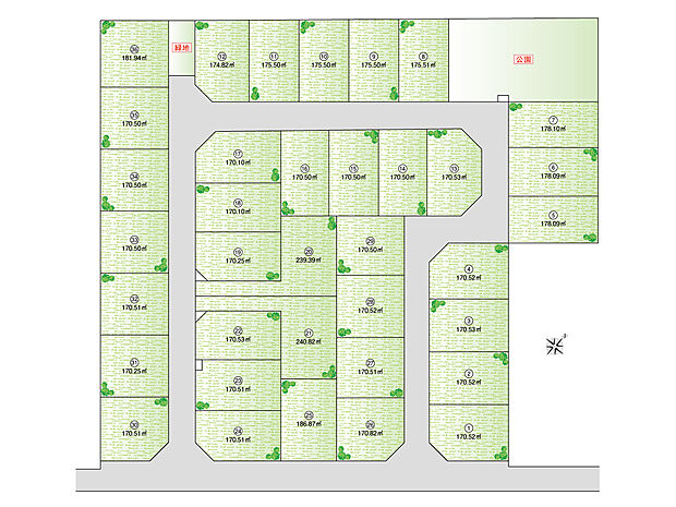 | 土地面積 | 170.1m2~240.82m2(20・21号棟路地状部分 約50m2含む) | ||