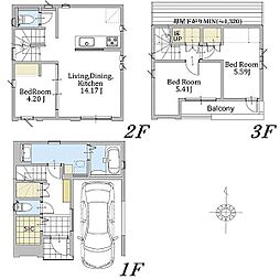 | 間取り | 3LDK 間取り内訳:洋室 5.3帖(1階)・リビングダイニングキッチン 17.6帖(2階)・収納 8.2帖(3階)・洋室 5.6帖(3階) |