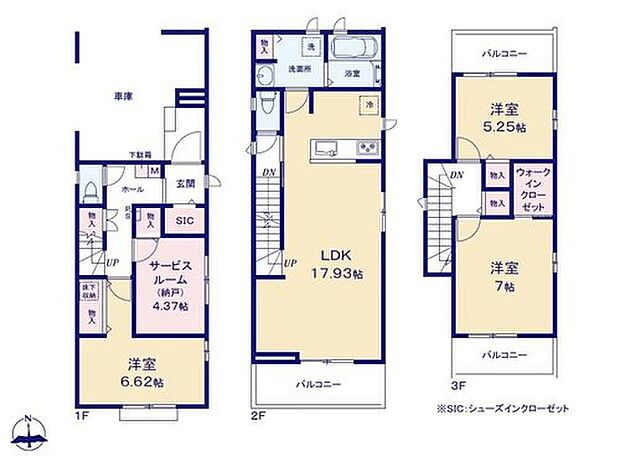 ゆとりの~17.93帖LDKと、1階と3階に家族それぞれのくつろぎの空間を確保したプラン。