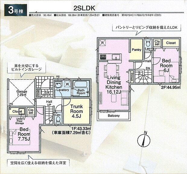 建物面積 82.62m2~88.28m2(3号棟車庫面積7.29m2含む)