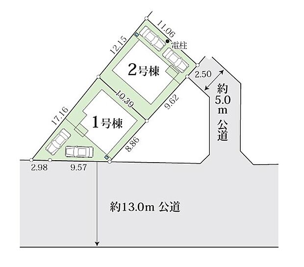 2号棟:北東5m /1号棟:南東13m