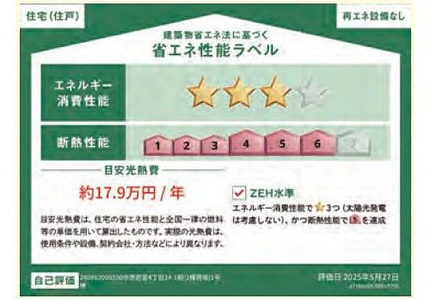 - 星マークの数が多いほどエネルギー消費性能が高いことを示しています。再エネ設備のない住宅は★0~★4の5段階評価、再エネ設備がある住宅は★0~★6の7段階評価となります。