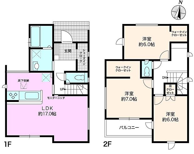 | 間取り | 3LDK 間取り内訳:リビングダイニングキッチン 17.5帖(1階)・洋室 8帖(2階)・洋室 6帖(2階)・洋室 5.2帖(2階) |