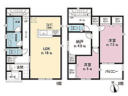 | 間取り | 2SLDK 間取り内訳:リビングダイニングキッチン 16帖(1階)・洋室 7.5帖(2階)・洋室 5帖(2階)・収納 4.5帖(2階) |