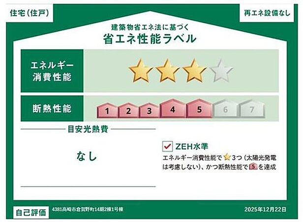 - 星マークの数が多いほどエネルギー消費性能が高いことを示しています。再エネ設備のない住宅は★0~★4の5段階評価、再エネ設備がある住宅は★0~★6の7段階評価となります。