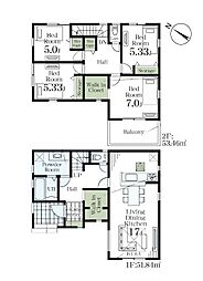 間取り内訳:リビングダイニングキッチン 17帖(1階)・洋室 7帖(2階)・洋室 5.3帖(2階)x2・洋室 5帖(2階)