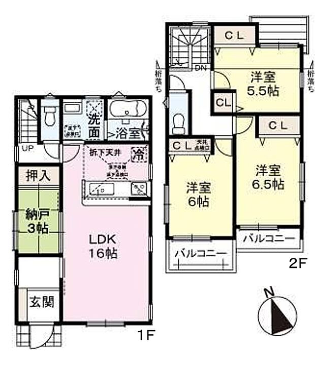 | 間取り | 4LDK 間取り内訳:リビングダイニングキッチン 16帖(1階)・和室 3畳(1階)・洋室 5.5帖(2階)・洋室 6帖(2階)・洋室 6.5帖(2階) |
