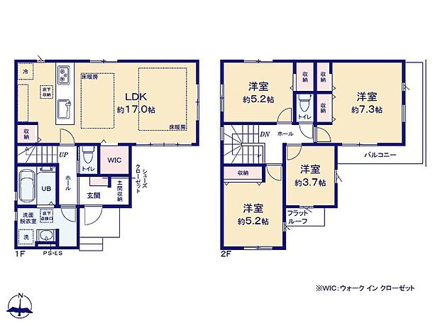 西武多摩湖線一橋学園駅徒歩12分の距離。並列2台(車種による)駐車可能なスペースがあるなど利便性を備えています。 外に出しっぱなしにしたくない自転車やアウトドア用品などが片付く土間収納や、ご家族で使えるウォークインクローゼットをリビングに設けました。17帖のLDKを広々と利用できそうですね。 プライベート空間をしっかり確保する2階の4部屋。全室二面採光で明るさや風通しも考慮された心地の良い空間です。
