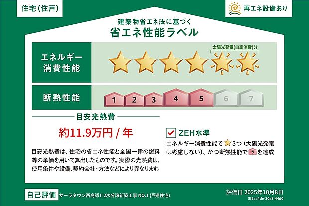 - 星マークの数が多いほどエネルギー消費性能が高いことを示しています。再エネ設備のない住宅は★0~★4の5段階評価、再エネ設備がある住宅は★0~★6の7段階評価となります。